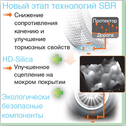 — «гибридный» состав резиновой смеси повысил сцепление на мокром дорожном покрытии и снизил потребление топлива.
