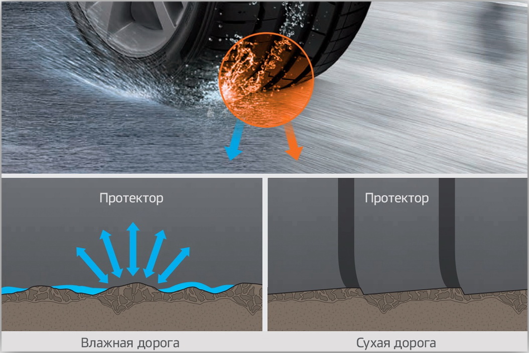 Обеспечивают повышенную устойчивость при аквапланировании или торможении на мокрой поверхности за счет увеличенного количества внутренних блоков, гарантируя тем самым эффективный отвод воды.