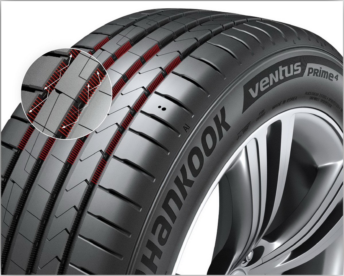 Конструкторы Hankook также добивались от шин еще более предсказуемой управляемости на сухих дорогах, что и было целью многочисленных субъективных испытаний на недавно построенном испытательном центре Hankook в Идиаде, Испания. В то время как предыдущие прямоугольные края блоков протектора имели тенденцию к скручиванию и скольжению при сильном боковом ускорении, блоки Ventus Prime 4 имеют закругленные края, которые предотвращают это явление. Это обеспечивает наилучшее сцепление протектора с дорогой даже на поворотах гоночной трассы. Технология Zigzag 3D Trend Technology, впервые использованная в летних шинах Hankook, также улучшает управляемость на сухой дороге, поскольку увеличивает силу трения блока в соответствии с его деформацией.