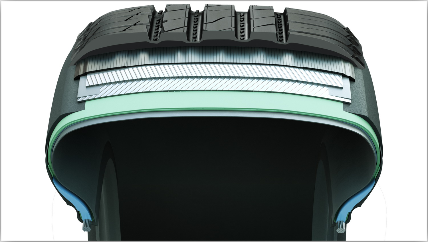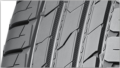 На наружных продольных ребрах в центральной части выполнено множество глубоких диагональных канавок, открытых с одного конца, которые стабилизируют управляемость. Данные канавки также эффективно предотвращают аквапланирование, накапливая воду и направляя ее в продольные канавки.