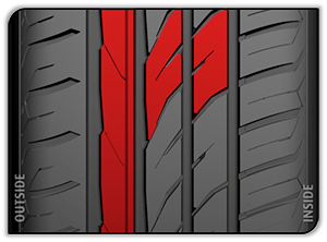 Жесткие блоки и ребра в центральной части шины улучшают передачу тягового и тормозного усилия на дорогу. За счет этого достигается прямой отклик на рулевое управление. На сухих дорогах обеспечивается хорошая управляемость и короткий тормозной путь.