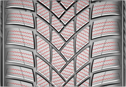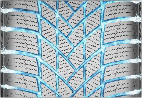 V-образная система водоотводящих каналов максимально эффективно выводит снег и грязь из зоны пятна контакта шины с дорожным полотном.