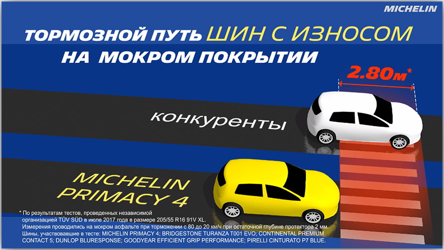 1] По результатам тестов, проведенных независимой организацией TÜV SÜD по запросу компании Мишлен в июле 2017 года в размере 205/55 R16 91V XL. Измерения проводились на мокром асфальте при торможении с 80 до 20 км/ч. Шины, участвовавшие в тесте: MICHELIN Primacy 4, BRIDGESTONE Turanza T001 Evo, CONTINENTAL Premium Contact 5, DUNLOP Bluresponse, GOODYEAR Efficient Grip Performance, PIRELLI Cinturato P7 Blue.