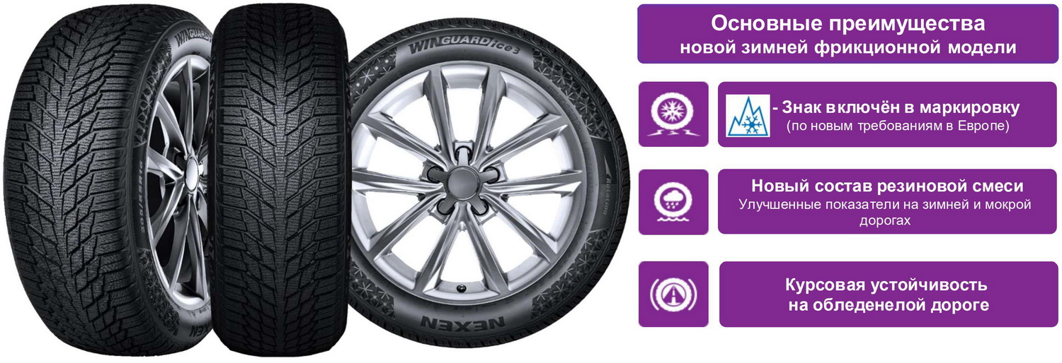 NEXEN WinGuard Ice 3 — зимние шины для легковых автомобилей и SUV с симметричным направленным V-образным рисунком протектора. Cозданы для суровых зимних условий. Эта нешипованная шина предназначена для обеспечения высоких эксплуатационных характеристик на льду и снегу. Конструкция шины снижает вес, сохраняя при этом эффективное сцепление с дорогой, способствуя лучшей топливной экономичности и общему контролю в зимних условиях вождения.