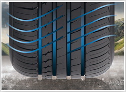 Наряду с четырьмя продольными круговыми канавками, протектор также оснащен отводящими диагональными каналами для дренажа воды. Эти боковые канавки препятствуют аквапланированию и одновременно с этим увеличивают сцепление на мокрой поверхности.