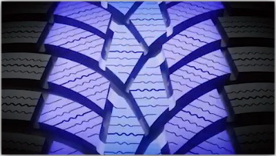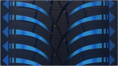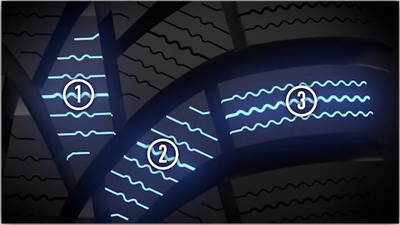 На блоках протектора нанесено множество волнообразных 3D-ламелей, которые способствуют высокой управляемости на мокром и сухом покрытии, а также обеспечивают краевой эффект для лучшего сцепления на заснеженной и скользкой дороге. Кроме того, 3D-ламели эффективно предотвращают неравномерный износ. Широкие ламели [1] в центральной части протектора повышают динамические характеристики и курсовую устойчивость на прямых участках дороги. Узкие ламели [2] способствуют управляемости в поворотах. Тяговые ламели [3] в плечевой зоне обеспечивают хорошее сцепление и торможение на снегу.