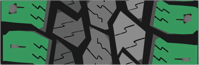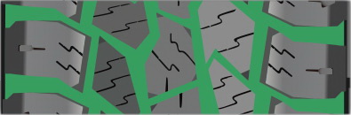 Поперечный дизайн обеспечивает расширенное пятно контакта с дорожной поверхностью, хорошее сцепление на бездорожье и высокую износостойкость..