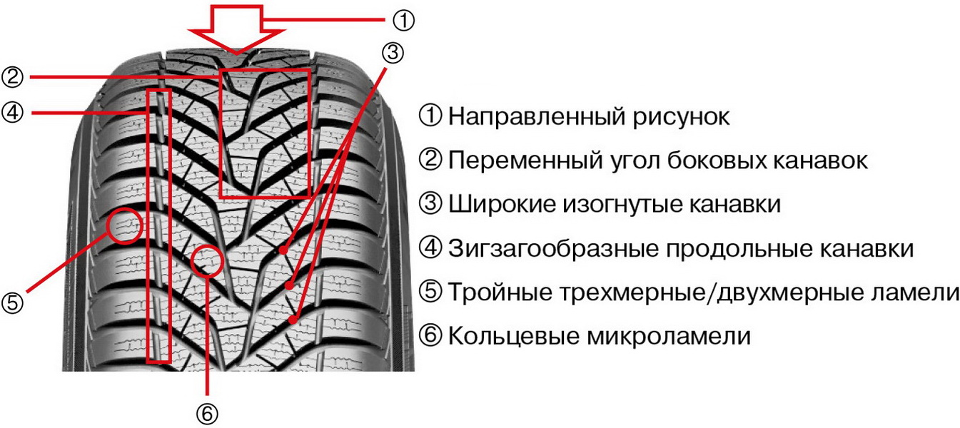 Тяговое усилие улучшается за счет направленного рисунка [1] протектора автошины и боковых канавок [2], которые располагаются под разными углами. Зимние эксплуатационные характеристики улучшают продольные зигзагообразные каналы [4] на покрышках. Снег и грязь эффективно отводят из пятна контакта широкие канавки [3], располагающиеся от центра в разные стороны. Кольцевые микроламели [6] в блоках протектора обеспечивают максимальное сцепление на заснеженных и обледенелых дорожных покрытиях даже до окончания обкаточного периода шины.