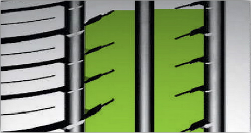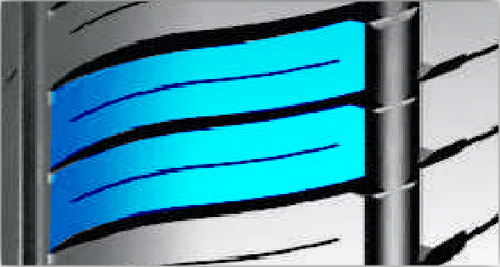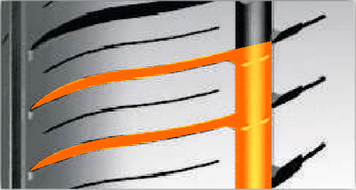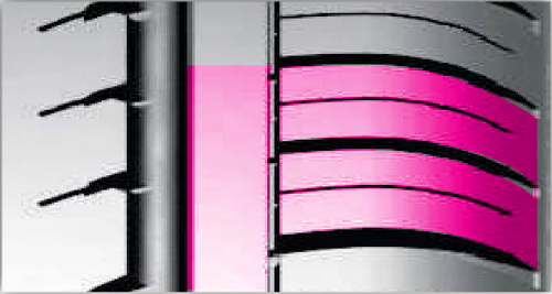 Открытая внутренняя сторона более насыщена и рассечена дугообразными канавками, которые полностью удаляют воду, что обеспечивает высокую устойчивость шины к аквапланированию.