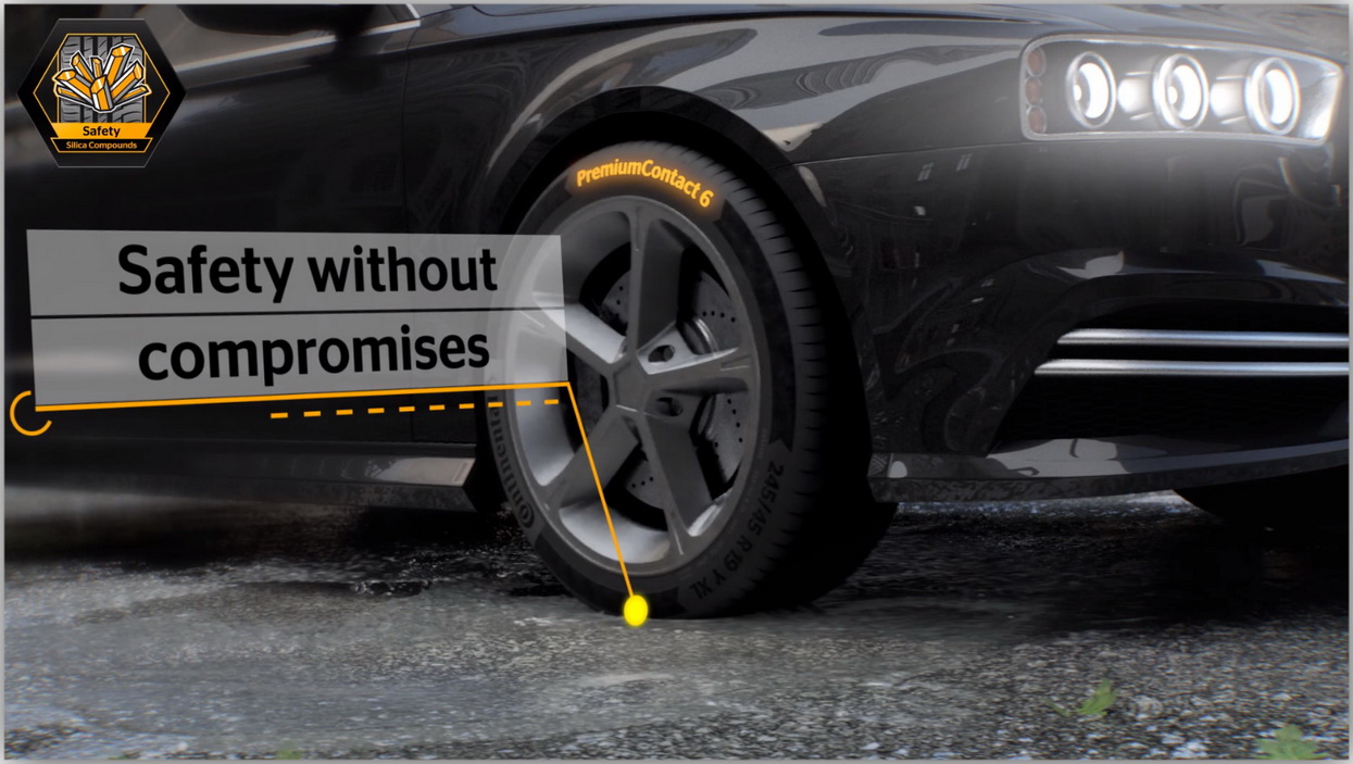 Новые шины PremiumContact 6, как и её предшественницы — ContiSportContact 5 и ContiPremiumContact 5, предлагают эффективность торможения премиум-класса, особенно на мокрой дороге. Химики-технологи CONTINENTAL придумали решение, которое позволило добиться существенного прогресса и в других параметрах шины без необходимости отказаться от высоких параметров безопасности. Инновационным решением стал новый синтетический аморфный силикосодержащий компаунд, обеспечивающий короткий тормозной путь на мокрой дороге. Модель CONTINENTAL PremiumContact 6 за сцепление с мокрой дорогой по европейской системе маркировки шин имеет наивысший рейтинг – «А».