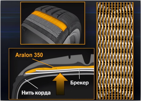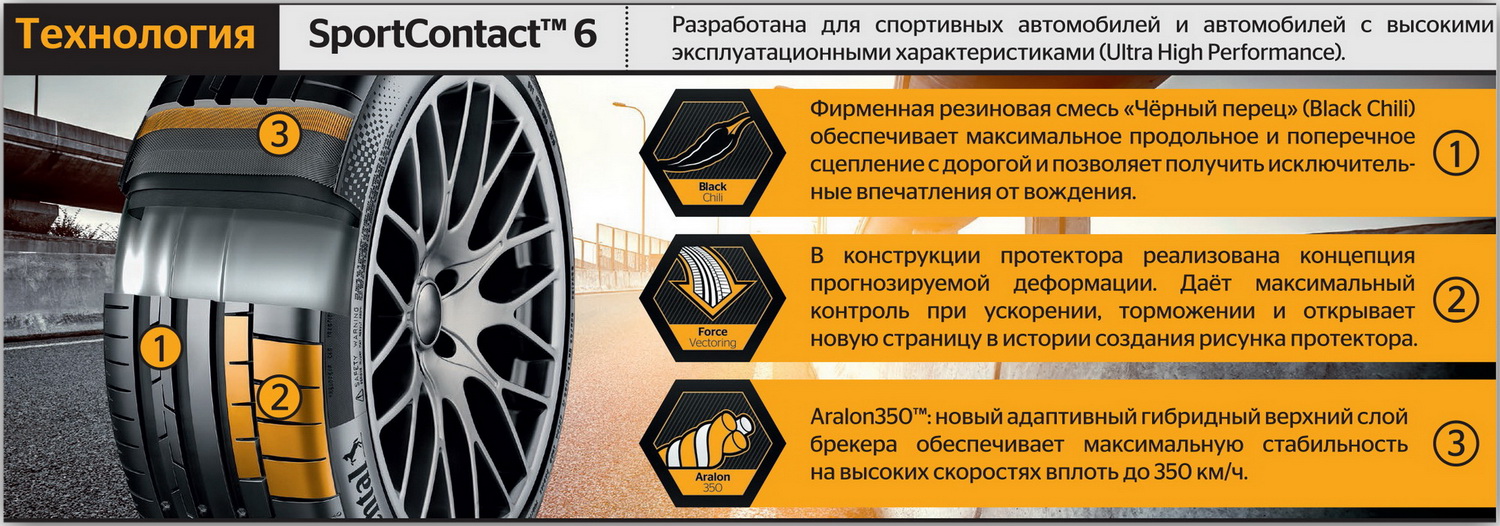 Чем выше темп движения, тем сложнее шине сохранять оптимальную форму в пятне контакта для максимального сцепления с дорогой. В каркас шины SportContact 6 добавлен новый верхний адаптивный слой Aralon350™, выполненный из крученых арамидных и синтетических нитей – схожий материал применяется при производстве бронежилетов. Эта технология позволяет шине сохранять стабильные характеристики на скорости до 350 км/ч.