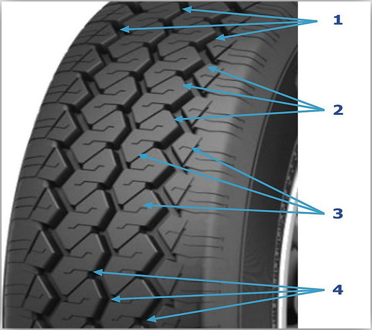 [4] Широкие тупиковые канавки трапециевидной формы, расходящиеся к продольным зигзагообразным канавкам улучшают проходимость и самоочищаемость шины при эксплуатации автомобиля на грунтовых дорогах и легком бездорожье.