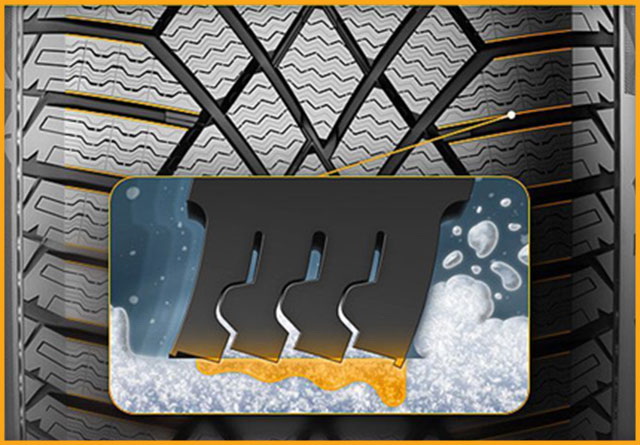 Большое количество трехмерных ламелей для улучшенных тяговых характеристик на снегу и эффективные кромки зацепления со снегом для отличной управляемости и торможения на заснеженных и обледенелых дорогах.