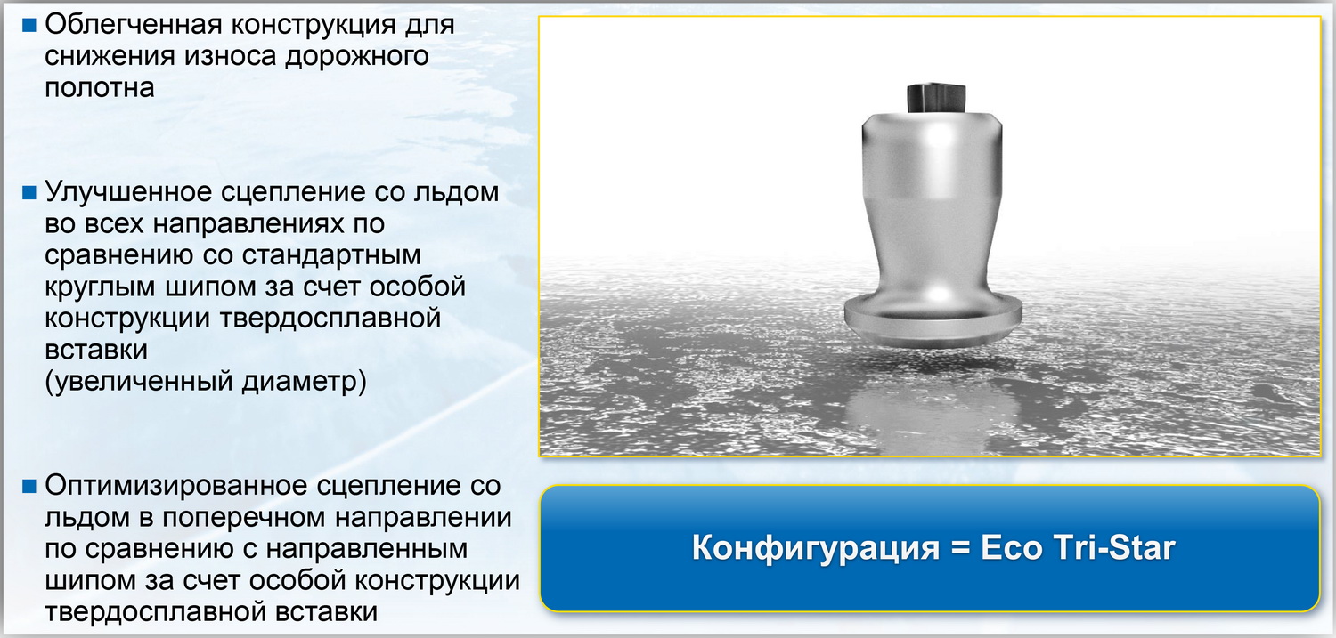 Недавно разработанные шипы Gislaved Eco Tri-Star обеспечивают значительные преимущества. Их меньший вес позволяет размещать больше шипов на одной шине, что заметно улучшает сцепление со льдом.