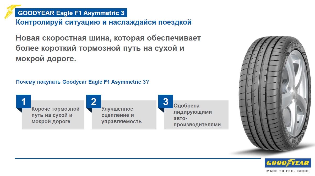 GOODYEAR Eagle F1 Asymmetric 3 отличается лёгкой отзывчивой управляемостью и непревзойдённым сцеплением в сухих и влажных условиях. Модель, впервые представленная в 2016 году, ещё до официального старта продаж успела пройти апробацию на таких известных гоночных треках, как Road Atlanta, Nurburgring Nordschleife и Virginia International Raceway. Использование этой модели высокоэффективных шин сократит тормозной путь на мокрой и сухой дороге, обеспечит отличную управляемость и позволит в полной мере насладиться поездкой.