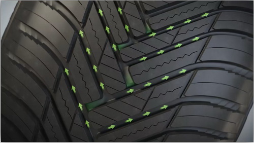 Для всепогодных шин важно, чтобы смесь для шин оставалась эластичной и не затвердевала при низких температурах. Только так пятно контакта шины может сохранить необходимое количество точек соприкосновения с дорогой и обеспечить требуемое сцепление для безопасного вождения при минусовых температурах. Тонкие трехмерные прорези в центральном протекторном блоке увеличивают площадь пятна контакта, гарантируя оптимальное сцепление с заснеженным покрытием. Специальный трехмерный волнообразный рисунок не только обеспечивает шине Kinergy 4S² устойчивость и короткий тормозной путь в зимнее время, но также снижает износ прорезей в условиях повышенной нагрузки на шину при высоких температурах. Оптимизированная поверхность протектора с V-образными поперечными канавками также улучшает управляемость и общую боковую устойчивость на покрытых снегом дорогах.