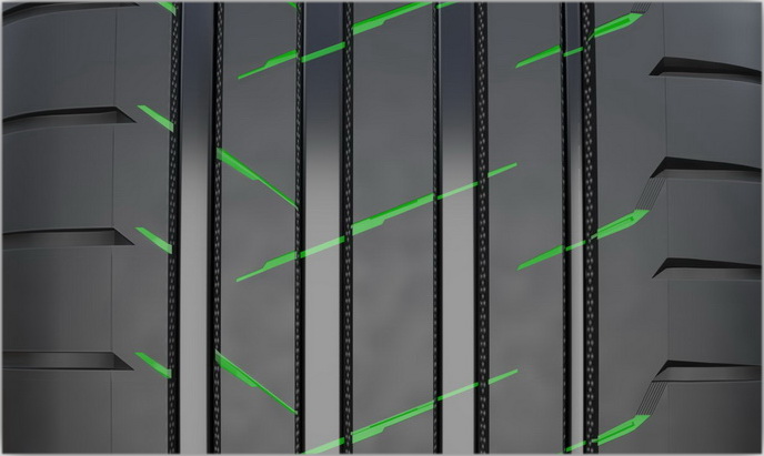 Глубокие канавки на продольных центральных ребрах, оптимизация которых производилась при помощи компьютера, эффективно собирают воду. Открытое строение канавок ускоряет вывод воды в широкие полированные главные канавки, которые эффективно отводят воду из пятна контакта.