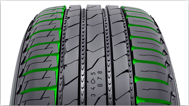 На наружных продольных ребрах в центральной части выполнено множество глубоких диагональных канавок, открытых с одного конца, которые стабилизируют управляемость. Данные канавки также эффективно предотвращают аквапланирование, накапливая воду и направляя ее в продольные канавки.