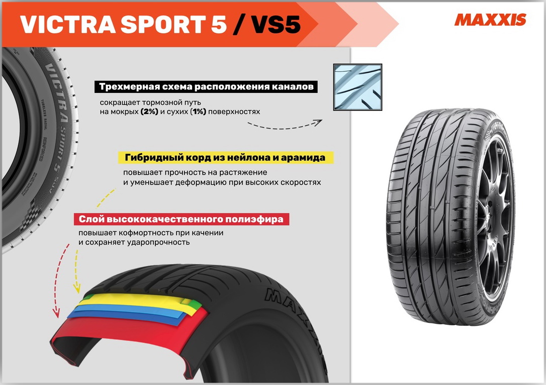 MAXXIS Victra Sport 5 SUV обладают максимальными показателями по управляемости и торможению на сухом и мокром асфальте, а также по уровню комфорта. Отмечается также, что угол наклона стенок канавок был оптимизирован для того, чтобы обеспечивалась необходимая устойчивость при прохождении поворотов, в том числе на больших скоростях.