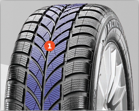 Инновационная формула в резиновой смеси для сохранения пластичности шины при сверхнизких температурах.