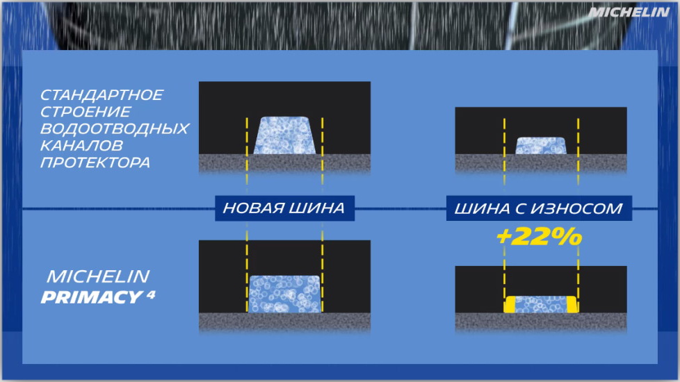 MICHELIN Primacy 4 отличается высокими характеристиками на мокром покрытии как в новом состоянии, так и с износом (вплоть до появления индикатора, указывающего на минимально допустимую остаточную глубину протектора в 1,6 мм).