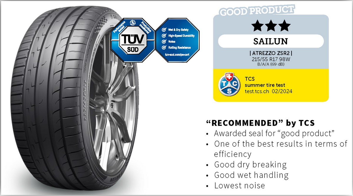 Шины SAILUN Atrezzo ZSR 2 протестированы и сертифицированы немецкой организацией контроля качества TÜV. В сравнительных испытаниях они превзошли своих конкурентов не только по экономичности (сопротивлению качению), но и по управляемости и торможению на мокрой поверхности.