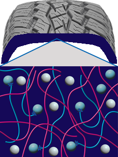 Благодаря специальному составу резиновой смеси с добавлением диоксида кремния достигнуты улучшенные характеристики на мокрой дороге, низкое сопротивление качению и увеличенный срок службы. В состав резиновой смеси с традиционной силикой и активными полимерами были включены специальные полимеры Long Life, продлевающие эксплуатационный срок шин Open Country A/T+ и улучшающие её тормозные свойства на асфальтированной трассе, особенно мокрой.