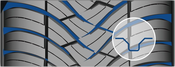 Асимметричная форма канавок предотвращает деформацию краев блока протектора во время торможения на мокрой и сухой поверхности.