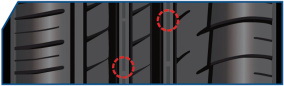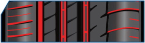 Три основные центральные канавки и поперечные наклонные бороздки способствуют уменьшению аквапланирования, обеспечивая хорошее сцепление на мокрой дороге.