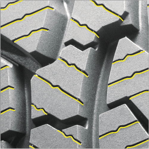 Одной из отличительных особенностей протекторного рисунка данной модели является наличие на большинстве блоков специальных ламелей. При соприкосновении с поверхностью дорожного покрытия они, раскрываясь, создают множество дополнительных кромок сцепления. Это позволяет шине более уверенно чувствовать себя на скользких дорогах. Кроме того, данные протекторные элементы обеспечивают дополнительный отвод тепла, что значительно продлевает срок службы протектора.