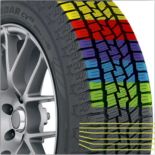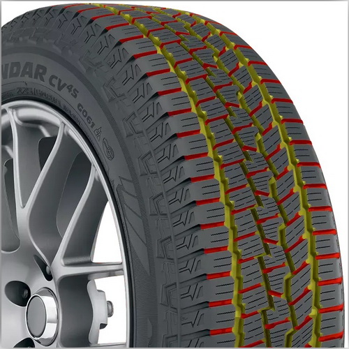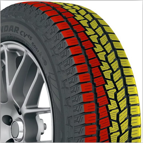 Внутренняя сторона шин обеспечивает низкий уровень шума, устойчивость и высокие тормозные характеристики для сцепления на мокрой дороге и снегу. Внешняя сторона — высокие сцепные качества на летних дорогах.