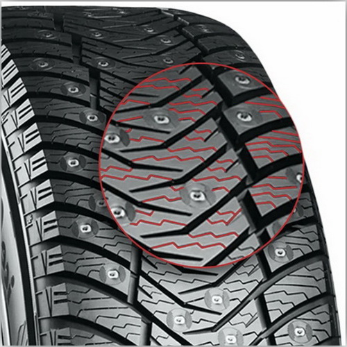 Зигзагообразный рисунок продольных канавок увеличивает площадь поверхности блоков, соприкасающихся с покрытием. Он улучшает сцепление с дорогой, устраняя пробуксовку при разгоне и сокращая протяжённость тормозного пути.