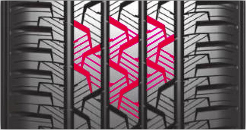 Благодаря такой конфигурации обеспечивается усиленная жесткость плечевой зоны, минимальная деформация при боковой нагрузке и устойчивость шины при поворотах на высокой скорости, как на сухом, так и на мокром покрытии.