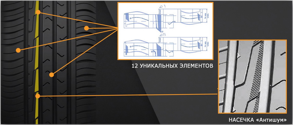 Акустический комфорт создается благодаря инновационной методике оптимизации чередования уникальных элементов протектора и специальным граням "Антишум". Амортизационные свойства обеспечивает более эластичная боковина и новый облегченный корд.
