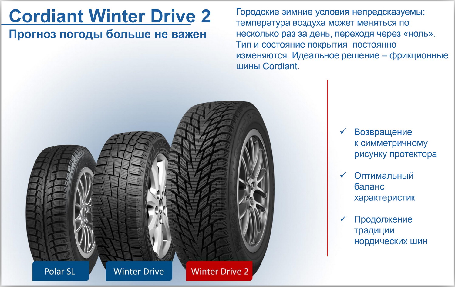 CORDIANT Winter Drive 2 SUV – зимняя шина с направленным симметричным рисунком протектора. Модель предназначена для комплектации широкого спектра полноприводных автомобилей и является преемницей широко известной и заслуженно почитаемой отечественными водителями покрышки Winter Drive первого поколения, которая производилась ярославскими шинниками начиная с 2012 года.