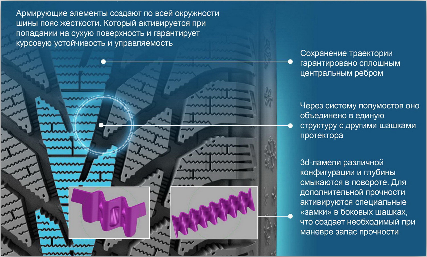 — улучшенный отвод воды и слякоти из пятна контакта снижает риск аквапланирования и повышает безопасность вождения в сложных погодных условиях.