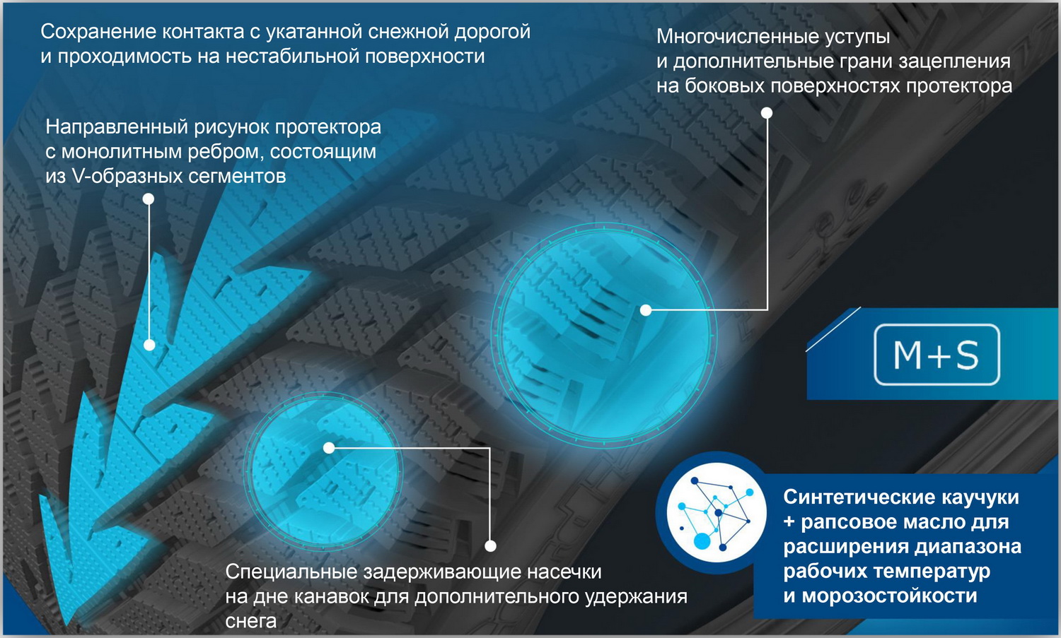 — направленный рисунок протектора обладает хорошей самоочищаемостью, высокими тормозными и сцепными свойствами, а также гарантирует отличную управляемость и курсовую устойчивость автомобиля;— увеличенное пятно контакта повышает коэффициент сцепления с поверхностью, что позволяет сократить тормозной путь и улучшить управляемость автомобиля;
