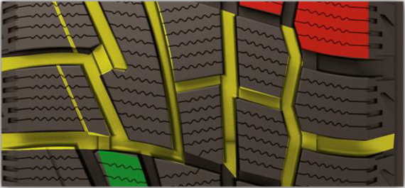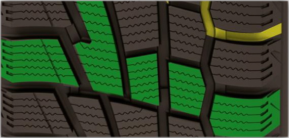 — двойные полумосты, соединяющие разновеликие шашки ребер протектора, увеличивают прочность боковой и центральной части, что позволяет повысить информативность рулевого управления и устойчивость на дороге;